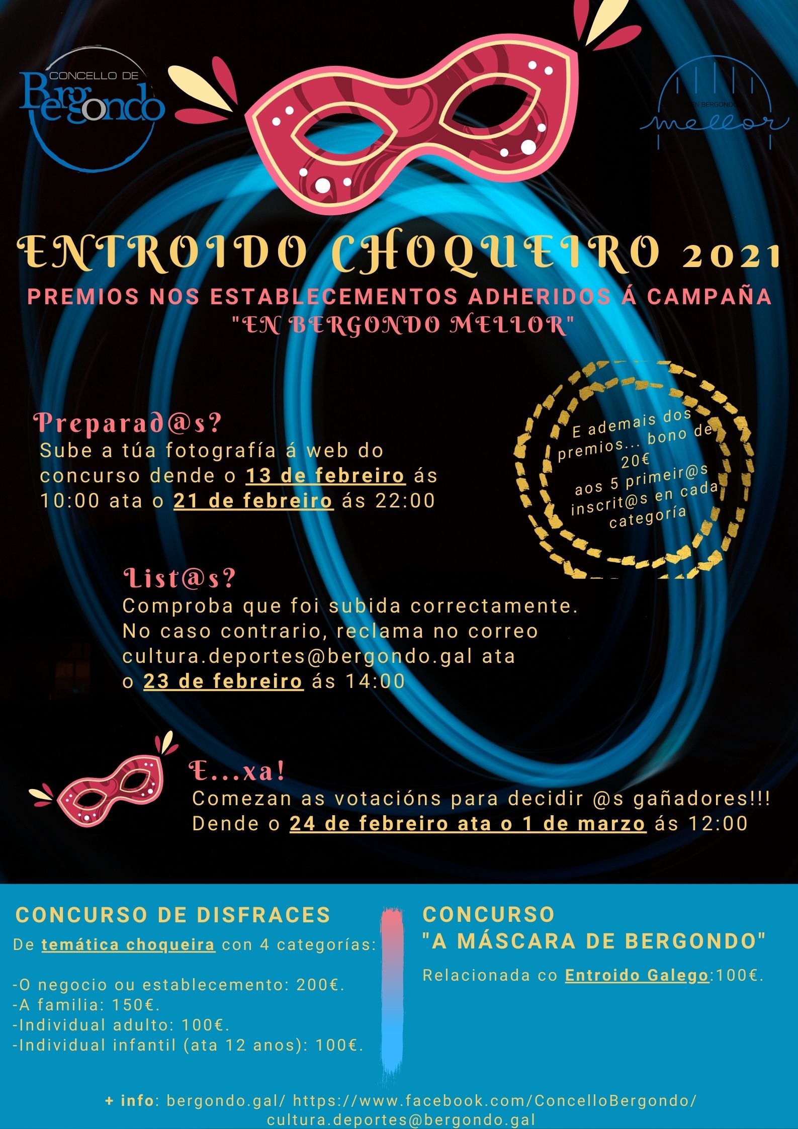 - CONCURSO “A MÁSCARA DE BERGONDO”: A máscara ten que estar relacionada co entroido galego (por exemplo: peliqueiros de Laza, cigarróns de Verín, pantallas de Xinzo de Limia, boteiros de Viana do Bolo, etc.)